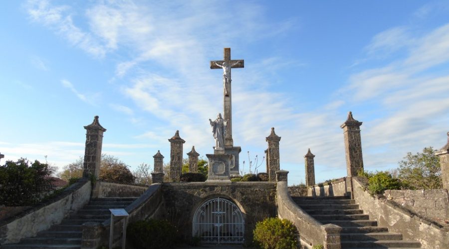 Lors de sa mission d’évangélisation du Poitou, Louis-Marie Grignion de MONFORT arrive à Sallertaine en mai 1712. Hué par la population, il réussit cependant à résoudre plus de cinquante procès et propose d’édifier un calvaire monumental pendant sa mission. Mais, un mois après son départ, le calvaire est détruit sous prétexte qu’on y cachait des armes !En 1852, une croix de bois avec un Christ en fonte fut posée sur le même lieu. 160 hommes, se relayant par groupes de 40 ont porté la croix du presbytère à l’église et de l’église au calvaire.