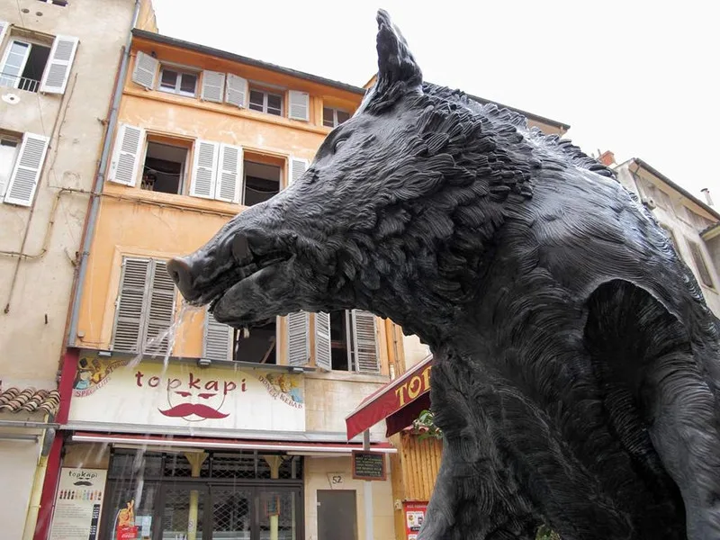 La Fontaine au Sanglier, située sur la Place Richelme à Aix-en-Provence, dans le département des Bouches-du-Rhône, a été initialement exposée à l’Hôtel de Ville dans les années 1980. Cette fontaine en bronze est une réinterprétation d’un marbre italien de l’époque Renaissance, œuvre de l’artiste Tacca. Elle met en scène un sanglier dont le groin est transformé en canon. À la base de la statue, on peut observer la présence de serpents, tortues et escargots, offrant ainsi un décor naturaliste. Cette fontaine, inspirée de modèles italiens, témoigne de l’influence de l’art de la Renaissance en France et de l’intérêt pour les représentations animalières dans l’art public.