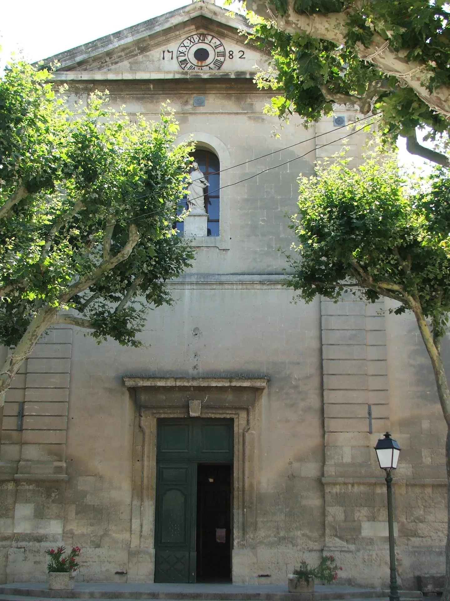 Le clocher de l’église a subi des dommages lors d’un tremblement de terre en 1909 et a été reconstruit par la suite. La façade de style classique présente un portail rectangulaire encadré de deux imposants pilastres corinthiens soutenant un fronton triangulaire. Une inscription sur ce fronton rappelle la date d’inauguration de l’édifice. À l’intérieur, on retrouve une architecture rappelant celle de l’église voisine de Saint-Croix à Maussane, avec des voûtes en berceau et des baies en cintre surbaissé éclairant la nef. Le chevet, presque plat, était autrefois orné de peintures murales.
