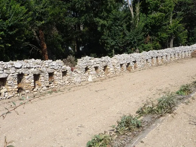 Situé dans les Bouches-du-Rhône, à La Roque-d’Anthéron, se trouve un apié, un mur à abeilles construit en pierres sèches. Ce type de construction, datant probablement de l’époque romaine, est caractérisé par la présence de niches destinées à accueillir les ruches. Celui de La Roque compte 36 niches et est l’un des plus longs de Provence. Orienté vers le soleil levant et bien préservé, il offre une protection contre le mistral. Bien que situé sur une propriété privée, il est visible depuis la route, offrant ainsi un aperçu de cet élément architectural traditionnel de la région.