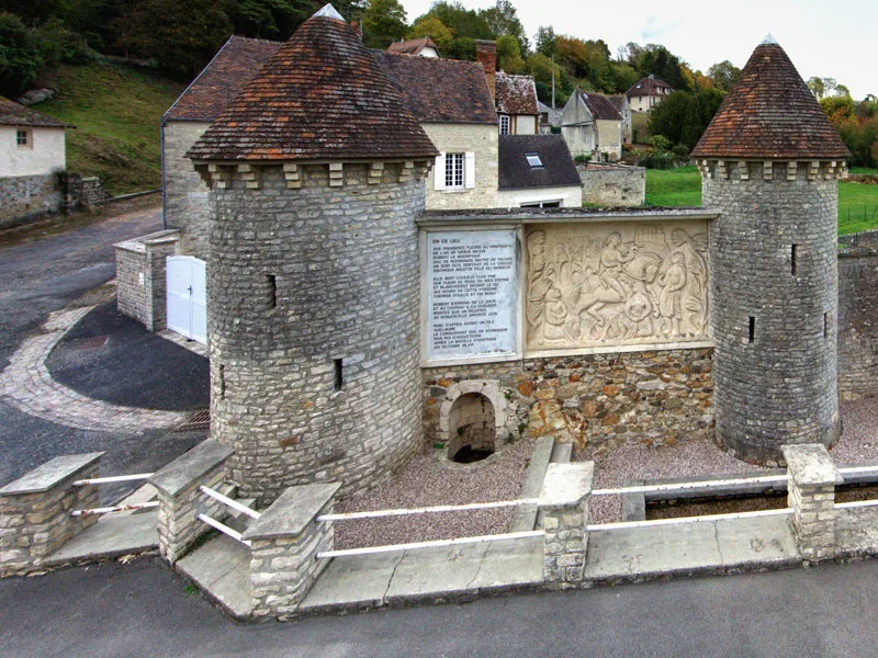 La Fontaine de Falaise, communément appelée la Fontaine d’Arlette, présente un bas-relief illustrant la rencontre entre Robert le Magnifique et Arlette en train de laver du linge. Selon la légende, le duc Robert, de retour de la chasse, croise Arlette au pied du château alors qu’elle effectue sa lessive à la fontaine du Val d’Ante. Robert, séduit par la jeune fille, l’invite au château. Après une nuit où Arlette rêve d’un arbre gigantesque couvrant la Normandie et l’Angleterre, elle donne naissance à un fils, Guillaume, surnommé le Bâtard. Cette histoire témoigne de l’origine de Guillaume le Conquérant, figure emblématique de l’histoire normande et anglaise.