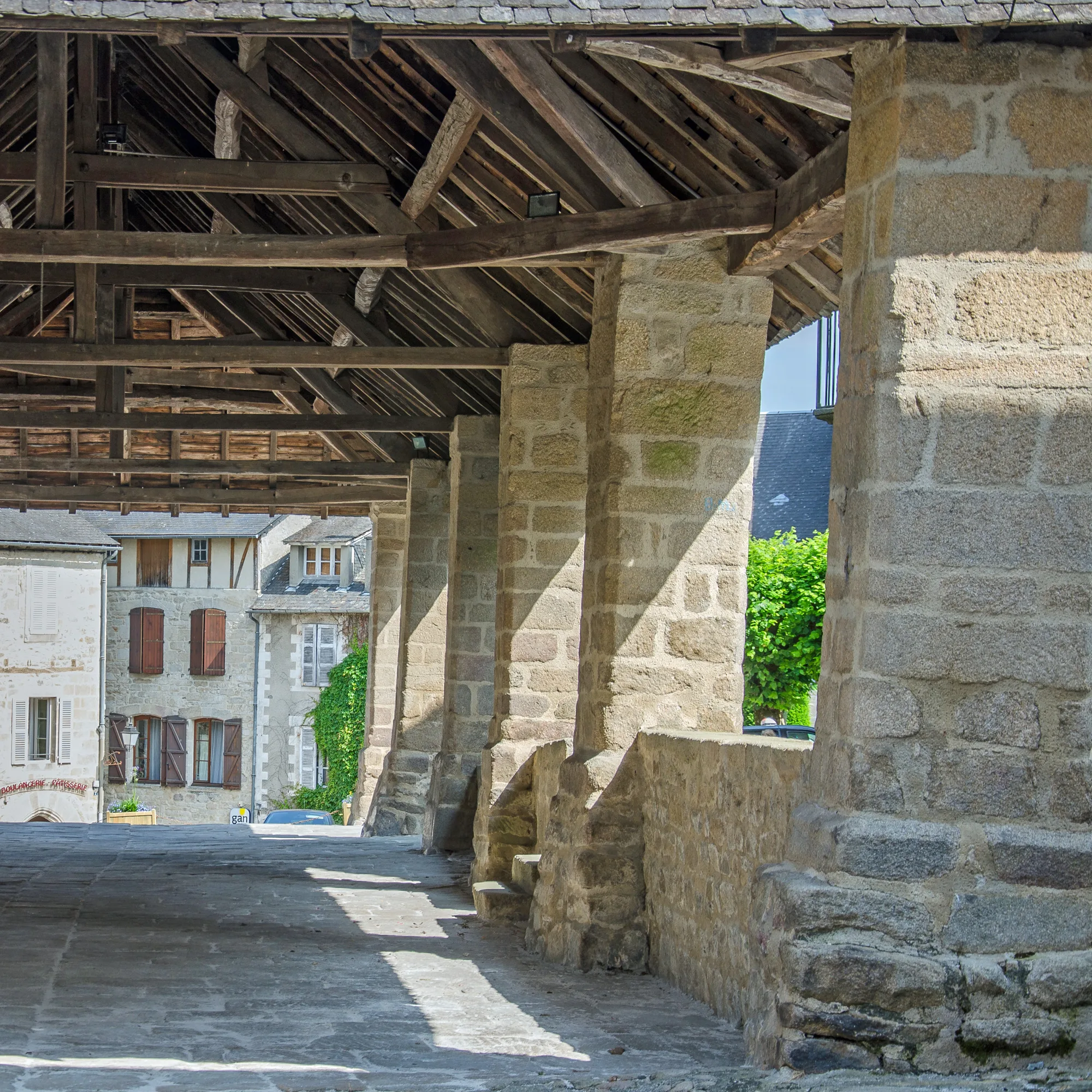 La structure de la halle est soutenue par douze piliers en châtaignier, bien que deux d’entre eux aient été abattus en 1910 pour des raisons de circulation. La couverture en ardoises de Travassac ajoute à son charme et à son authenticité. Un appentis grillagé sur la droite servait autrefois à enfermer les poids et mesures, soulignant le rôle commercial et administratif de ce lieu emblématique.
