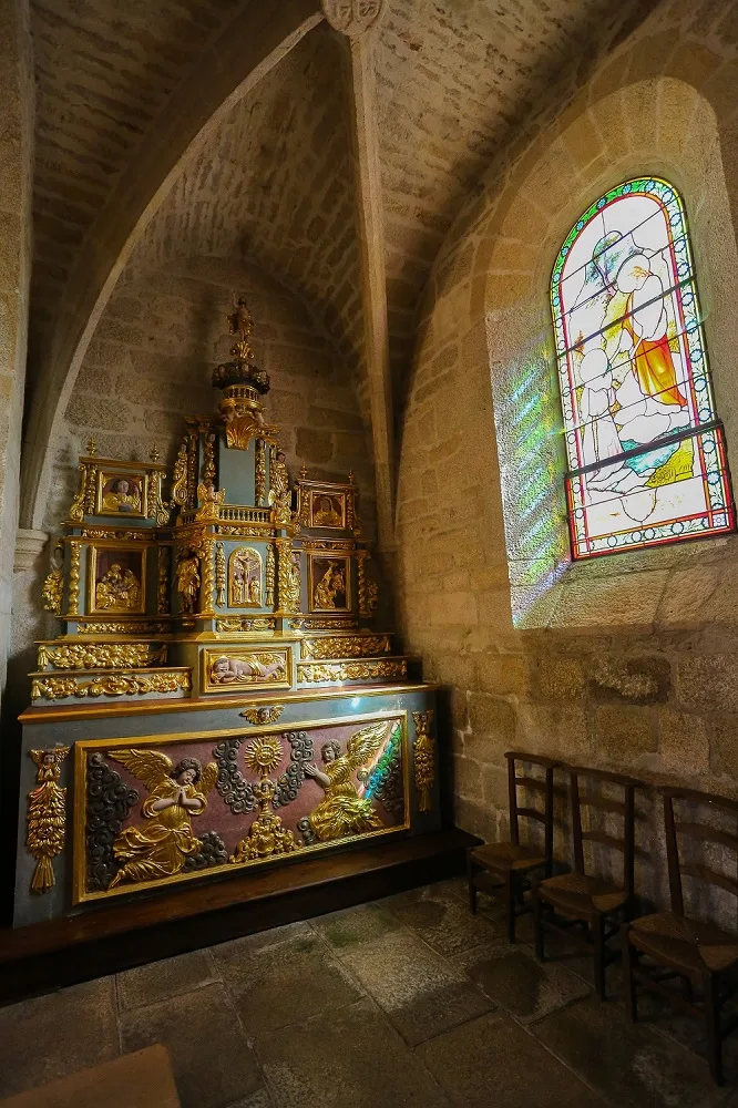 Le tabernacle, avec ses ailes, présente des éléments symboliques significatifs. Sur la porte, un calvaire est représenté, accompagné de deux niches abritant des statues de Saint Jacques le Majeur et d’une sainte non identifiée. Des enroulements remplacent les coquilles traditionnelles, et au sommet, une scène de la Résurrection est mise en avant. En outre, l’autel met en scène l’Adoration du Saint Sacrement par deux séraphins, inspirée d’une illustration de la Sainte Bible datant de 1581 conservée à la bibliothèque municipale de Tulle.