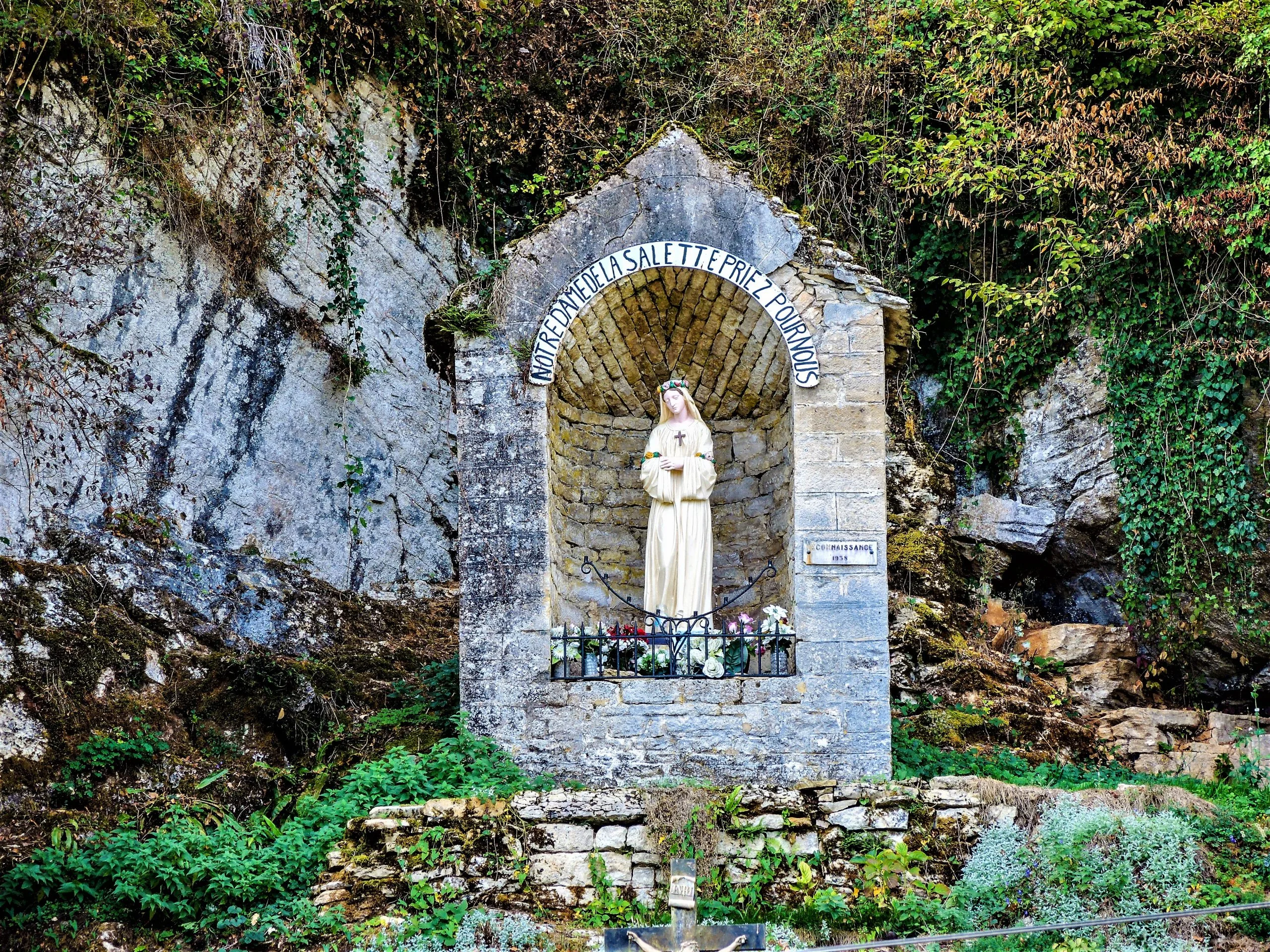 En façade, une baie en lancette encadrée d’une petite voussure abrite une porte en fer forgé délicatement ouvragée, ornée d’une rose à huit lobes et de trèfles. Au-dessus de cette porte, un médaillon affiche le monogramme marial, tandis que la date de 1866 est gravée en bas et à gauche. À l’intérieur, une statue de Notre-Dame de la Salette repose sur une imposante pile, entourée de deux crédences.