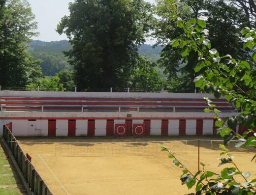 En retrait du village, l’église Saint Pardon, Pardou ou Pardulphe (à vous de choisir !) est située dans un cadre de verdure harmonieux d’où émerge son clocher-mur à cinq cloches.
