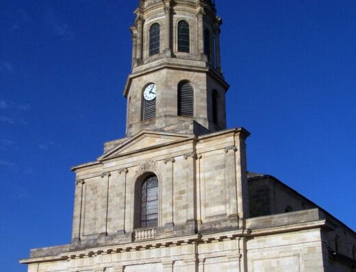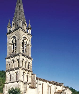 Le portail roman, ouvrant sur la façade occidentale, est encadré de 6 colonnes engagées, ornées de chapiteaux. L’archivolte, soulignée de dents-de-scie, et les voussures, décorées de motifs géométriques, couronnent le tympan, abritant les statuettes de la Vierge et de Saint Pierre. L’arc central, flanqué d’arcs de dimensions plus modestes, est surmonté d’une corniche, supportée par 15 modillons sculptés de figures humaines, de monstres et d’oiseaux.