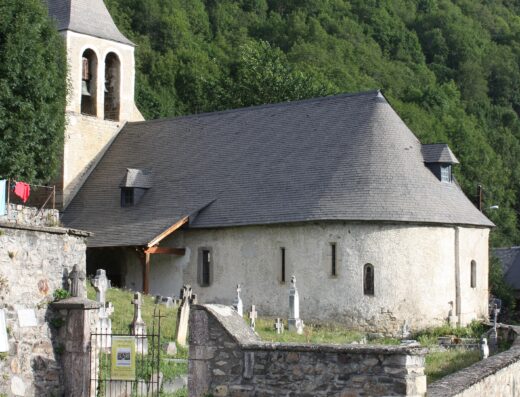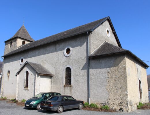 Également appelée l’église Saint-Caprais (ancien évêque d’Agen), elle possède un clocher-mur du XVIIIe siècle, couvert d’ardoises. Sa nef unique et ses deux chapelles latérales à chevet plat ont été redorées en 1864. Elle abrite un retable sur fond bleu ciel du XVIIIe siècle. On l’attribue, avec l’autel-tombeau, à l’atelier Dominique Ferrère. Il représente Saint-Caprais encadré par deux saints et quatre colonnes torsadées. Un petit dôme recouvre la partie centrale.Notez les beaux drapés des anges adorateurs de part et d’autre du tabernacle sculpté en 1737, par Cazaux d’Asté. Bernadette et sa famille vécurent une dizaine de mois dans ce village qui possédait alors 4 moulins et 2 scieries.