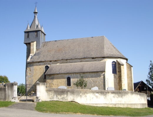 Cette église romane construite sur une terrasse possède un clocher-mur à deux arcades. Elle a un petit air de famille avec celle de Sazos. Dédiée à saint Martin, elle a subi de nombreuses transformations au XVIIIème siècle. Sous l’auvent important de 1731, le petit escalier de droite permet d’accéder à la tribune. Le chrisme de 73 cm sur tympan est curieusement encadré par deux taureaux surmontés d’arabesques, on dirait des taureaux ailés.
