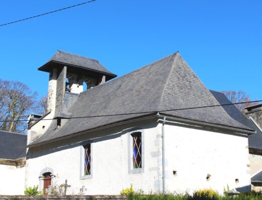 Cette église, dédiée à Saint-Michel, d’origine romane, a été reconstruite sauf le clocher, en 1856. Celui-ci, tour massive, abrite deux cloches. Celle de droite datée de 1949, remplace une ancienne cloche fêlée de 1874. Et celle de droite, de la même époque, plus petite, remplace une fêlée de 1871. Toutes deux ont été fondues par l’atelier Fourcade de Tarbes et ont été financées par souscription paroissiale. Le chrisme de 70 cm de diamètre, de belle facture a été réalisé en 1856, à partir de l’exemple roman préexistant. Il est proche du chrisme de l’église de Viey avec ses arcades représentant les portes du temple de la Jérusalem céleste et de Sers avec ses animaux. Cette église a été inscrite aux Monuments historiques en juillet 1990.