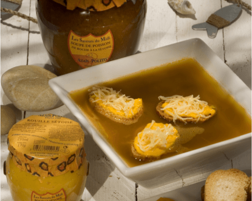 La rouille sétoise est l’une des grandes fiertés de la conserverie Azaïs-Polito. Avec l’aïoli et la soupe de poisson, les moules et les encornets farcis, elle fait partie des spécialités sétoises que la maison a été la première à mettre en conserve en France dès 1963. Plus qu’un simple condiment, la rouille avec sa couleur orangée incarne l’esprit de la cuisine sétoise, simple, authentique. Traditionnellement, elle nappe le poisson qui a mijoté en sauce tomate, révélant en bouche les saveurs du plat, qu’il s’agisse de moules, d’encornets farcis, de seiches…En lexique culinaire, on parle alors d’une présentation à la sétoise. Mais on la retrouve le plus souvent savoureusement tartinée sur les croûtons d’une soupe de poisson généreuse. L’élaboration de la rouille chez Azaïs-Polito est un marqueur fort de l’engagement artisanal de l’entreprise. La conserverie est en effet la dernière en France à fabriquer sa rouille et son aïoli avec des œufs frais cassés à la main. Contrairement aux procédés industriels qui utilisent de la poudre d’œuf pour gagner en rentabilité, ici chaque œuf est manipulé avec soin.Dans une production classique, ce sont environ 4500 œufs qui sont transformés. Le fameux dépotoir à coquilles visible lors de la visite témoigne de ce travail minutieux. Jadis catalogué comme les cromagnons de la fabrication par certains concurrents, cette méthode est aujourd’hui reconnue comme le véritable gage d’une fabrication d’excellence. Une fois les œufs cassés, l’émulsion est préparée à l’aide de machines spécifiques à l’entreprise. Équipée de lames conçues par Azaïs-Polito pour transformer les œufs en une texture onctueuse et ferme, fidèle aux faits maison. Chaque pot de rouille restitue ainsi le goût et la consistance des recettes traditionnelles, rappelant le soin et la précision des gestes ancestraux des grands-mères cuisinières sur les côtes de Méditerranée. La qualité de la rouille sétoise Azaïs Polito a été reconnue nationalement et internationalement. D’abord au concours Greatest Gold Award de Londres, où elle a obtenu deux Greatest Gold Awards, une distinction exceptionnelle pour les produits étrangers. Plus récemment, en 2023, elle a remporté une médaille de bronze au concours Épicures à Paris, le concours de l’épicerie fine français, c’est-à-dire troisième aux côtés de la soupe de poisson sur le podium.