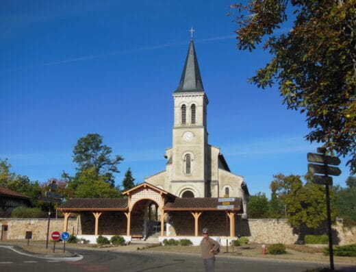 Petite église, mais combien curieuse est la porte ogivale d’entrée sous le porche, porte au dessus de laquelle, dans un encadrement sculpté, paraissent informes et éparpillés des bas-reliefs où l’on devine, entre autres, une petite pietà, un cavalier moyenâgeux, d’autres symboles énigmatiques… S‘agirait-il de « l’apocalypse » selon Saint Jean ? Le sanctuaire du XVème est rustique , intéressant par son clocher porche à flèche polygonale. L’intérieur abrite un tableau du 19ème siècle figurant le Christ en croix, don de Napoléon III. L’autel est orné de cinq statues dorées de Saints. Au cimetière qui entoure l’église, ornée d’un cadran solaire, nous trouvons la tombe délaissée, entourée de grilles oxydées, de Léonard, Antoine, Armand, d’Oro de Pontonx, Chevalier de l’Ordre royal et militaire de Saint-Louis, Maire de Louer, né à Pontonx le 7 novembre 1773 et mort à Louer le 5 juillet 1842.