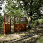 Dans ce lieu chargé d’un passé oublié, d’un mystère, Marie Denis invite à retrouver, à imaginer les indices et les signes que le temps et l’histoire ont mêlés ou effacés. Son portail Art déco, en fer forgé, se dresse sans ostentation, entouré de chênes, dans l’élégante nudité de son vécu, comme la vigie familière d’une mémoire à partager, et s’entrouvre pour laisser libre cours aux échanges entre le réel et l’imaginaire, le visible et l’invisible, l’ici et l’ailleurs. Il est paré de tubes de carillon en inox, agencés dans un équilibre sonore et intriguant. Le moindre souffle de vent l’anime et l’emporte dans une phrase musicale, imprévisible, enchantée et donc légendaire, qui a la fragilité d’un rêve et la simplicité primitive d’une émotion.