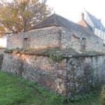 Cet ensemble est relié par une passerelle à la Basse-Cour, l’ancien manoir, devenu métairie au XVème siècle et possédant une grange en carène de vaisseau renversée. Un simple cordon de roussard forme une saillie suivant la ligne de toits. Cette pierre est employée pour les encadrements des ouvertures.