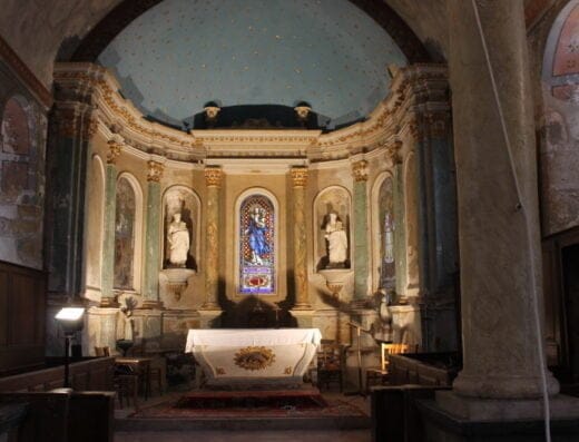 La petite église de Saint-Michel est située au bout d’une allée d’arbres qui fait face au château ; dans un village de la Forêt d’Orléans à l’habitat dispersé.