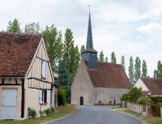 Eglise reconstruite au XVIème. Nef ancienne à l’est dont subsistent des contreforts. Portail Renaissance. Partie de nef ancienne étayée pour soutenir le poids du clocher. Nef plus récente orientée vers un grand vitrail étendu sur 5 lancettes, réalisé par Lucien-Léopold Lobin de Tours (1861), et qui illustre l’Ascension. St Saturnin à gauche, St Eloi à droite ( protecteur des chevaux et des professionnels du travail du métal)