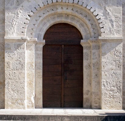 Le choeur est formé d’une abside demi-circulaire moins large que la travée de choeur qui la précède. Chaque fenêtre de choeur possède des colonnettes aux chapiteaux historiés (chute d’Adam et Eve ; adoration des mages…). L’édifice a perdu ses voûtes dont il ne reste que les retombées. La porte s’ouvre au sud dans la travée basse de la nef. Six colonnettes logées dans les retraits des piédroits soutiennent les archivoltes moulurées. L’ornementation du portail est riche. Le clocher s’élevait au-dessus de la travée carrée qui était voûtée d’ogives. © Monuments historiques Base Mérimée Architecture