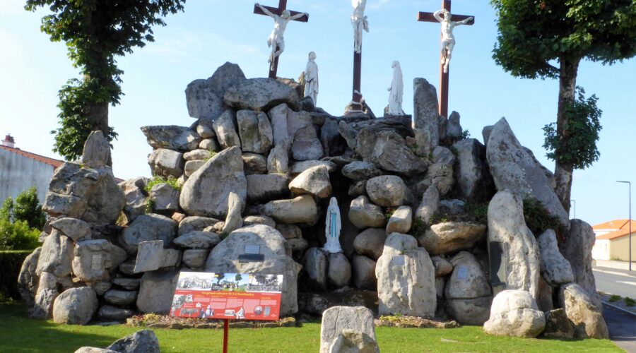 Les chiffres de sa construction impressionnent encore aujourd’hui. Le calvaire fut bâti en 56 mois grâce à la volonté, la force, et le courage des 1800 habitants. Les bœufs des agriculteurs furent employés pour tirer les chirons, pesant parfois plusieurs tonnes, qu’ils allaient chercher dans les champs à 3 kilomètres autour du village. Quatorze gros chirons furent amenés pour créer les stations du chemin de croix, tandis que 14 bœufs et une vingtaine d’hommes furent nécessaires pour transporter la pierre de 25 tonnes surnommée la Déesse, située à gauche de l’entrée du calvaire. A droite de cette même entrée, se trouve une autre énorme pierre surnommée la pierre du sacrifice. Ces deux pierres proviennent de 2 fermes de la Tourlandry.