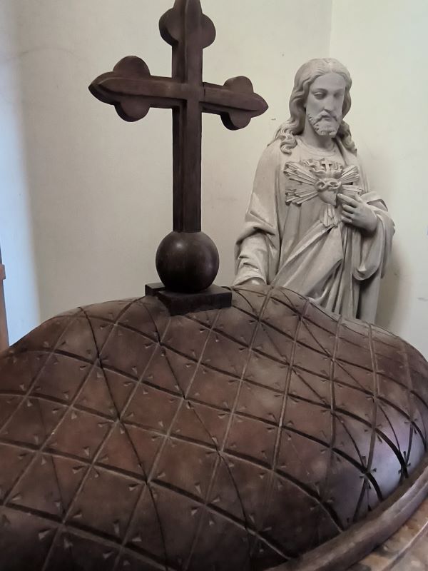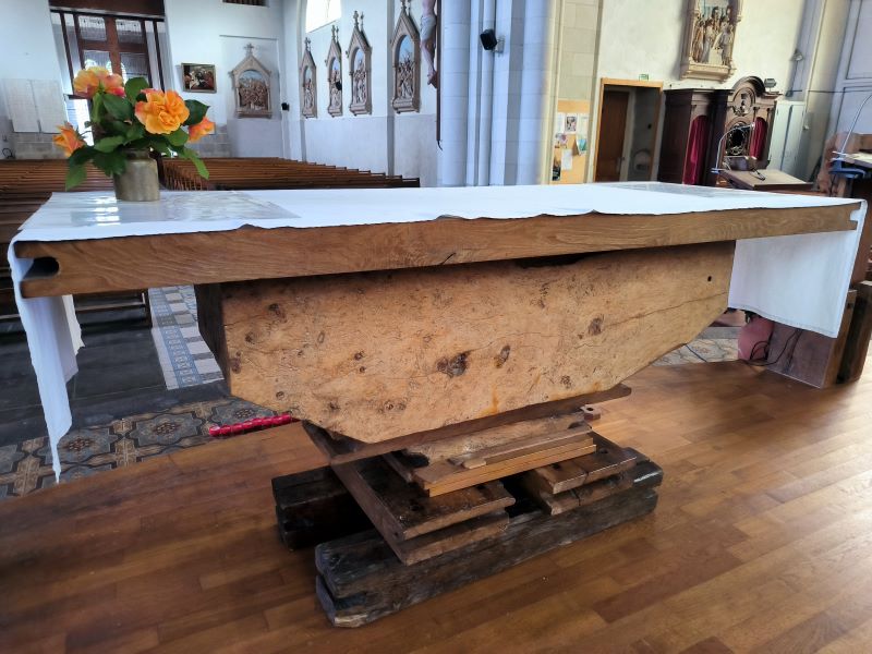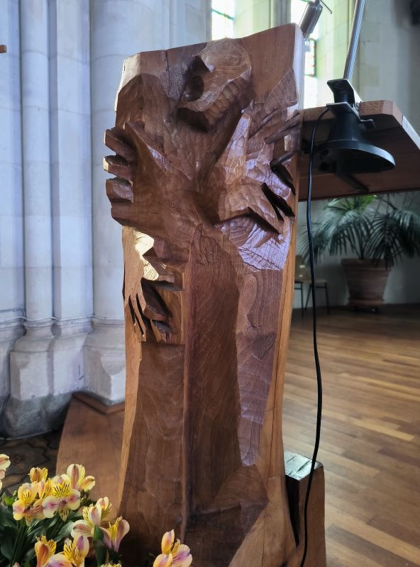 A l’intérieur, le chœur nous attire immédiatement par l’originalité de son mobilier liturgique. Il a été réalisé par Jean Touret, célèbre sculpteur français, né en 1916 et décédé en 2004. Son œuvre, principalement religieuse, allie le bois et les métaux afin d’aboutir à des sculptures parfois monumentales (statues, autels, buffets d’orgue). Son art reste figuratif mais s’approche aussi de l’abstraction. On lui doit notamment l’autel de la cathédrale Notre-Dame à Paris, remplacé après les travaux qui ont suivi l’incendie de 2019. Notons par ailleurs que deux de ses œuvres monumentales, prêtées par l’église Sainte-Jeanne de Chantal, ont été installées au Champ-de-Mars pour la messe célébrée par le pape Jean-Paul II aux Journées mondiales de la jeunesse en 1997.