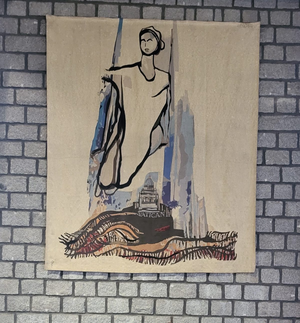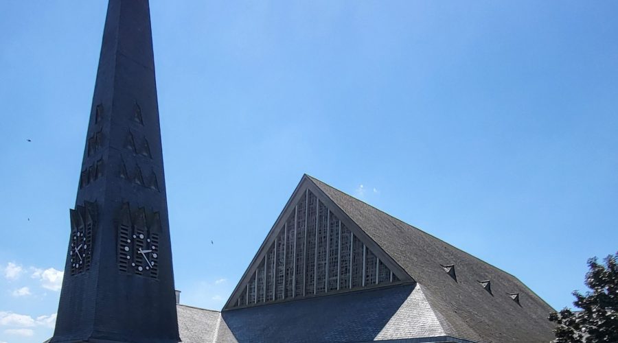 Notez que la chapelle à droite contient la grande croix miraculeusement préservée lors de bombardements. La tapisserie, située à gauche du chœur, évoque le concile Vatican II et a été tissée dans les Ateliers d’Aubusson.