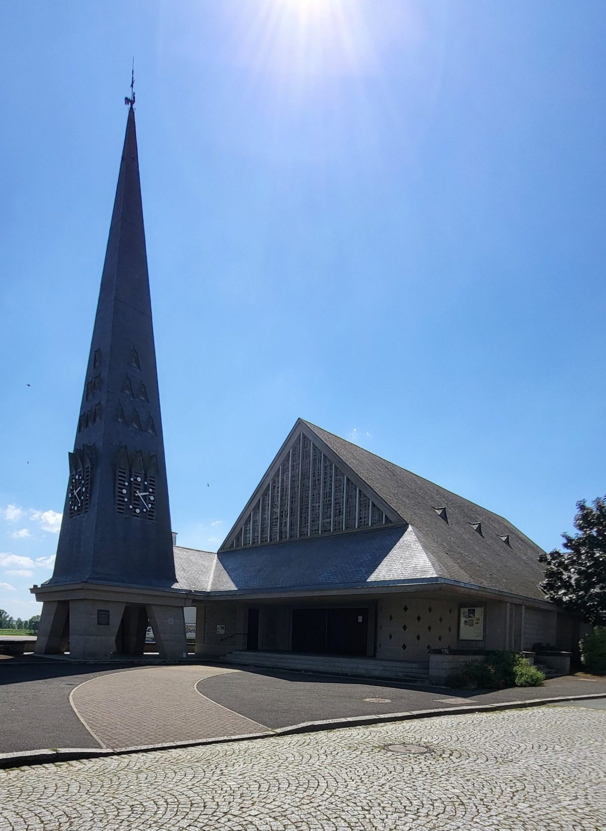 L’édifice de style contemporain mêlant béton et granit, avec son ample toiture d’ardoise qui enveloppe la nef unique et le chœur, s’intègre au mieux dans ce paysage des bords de Loire. Son clocher qui prend la forme d’une grande pyramide effilée impressionne le visiteur. A l’intérieur, on est facilement subjugué par l’ampleur de la surface occupée par les vitraux colorés. Ces vitraux modernes, non figuratifs, sont l’œuvre de l’atelier de Gabriel Loire angevin d’origine, maître verrier à Chartres. Ces nuances de gris, de rouge, de bleu et or évoquent le rythme du jour et appellent la médiation.