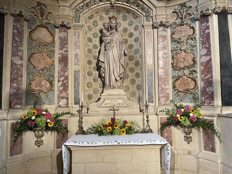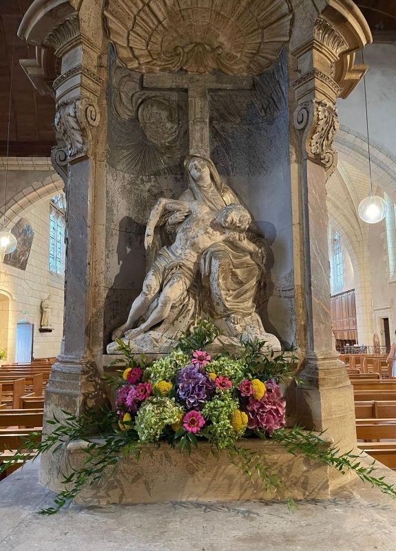 Notons à cet égard que l’édifice renferme d’autres trésors. Les murs de l’église reçoivent ainsi d’autres peintures, comme un portement de croix du XVIe siècle de grandes dimensions (de 6m85 sur 2m80), inspiré, selon la tradition, d’une œuvre poétique disparue du roi René. Admirons aussi les statues de la charité de saint Martin et celle de sainte Barbe, datant du XVIème siècle, ainsi qu’un « Christ aux liens » du XVIIème siècle, représentant Jésus pendant son procès. Enfin, l’autel principal daté de 1735, au fond du chœur, est une œuvre de Pierre-Etienne Surugue, connu pour ses sculptures du buffet d’orgue de la cathédrale d’Angers. Les deux anges portant d’une main une couronne royale ont été ajoutés en 1839.