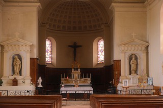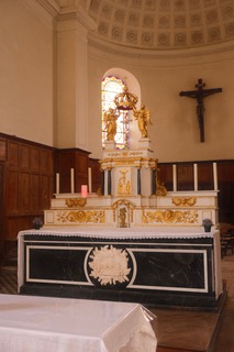 Le maître-autel, la partie centrale de la Sainte Table, les deux crédences en marbre noir ainsi que le Christ en bois, transférés ici lors de la Révolution, proviennent du chœur de la chapelle des Ursulines d’Angers.