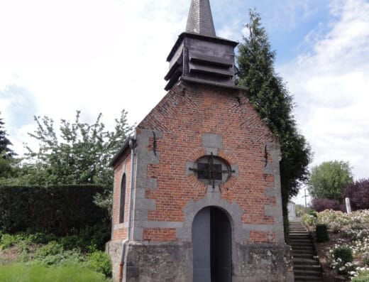 Calvaire sur tertre, au milieu d’une patte d’oie, en surplomb de la route mais encaissé dans le sommet de la butte.