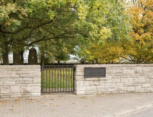 Calvaire construit en pierre bleue et brique, couvert d’un toit en ardoise.