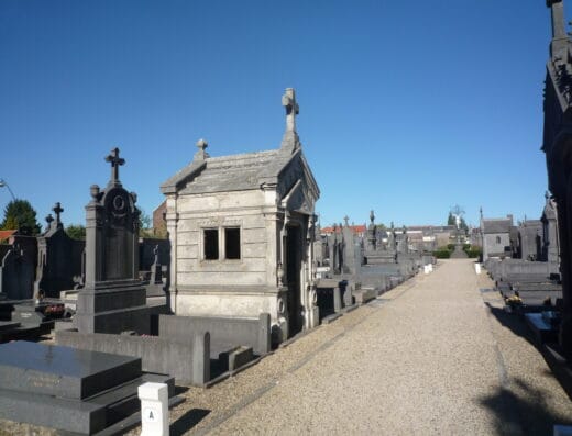 Calvaire couvert en pierre bleue datant de 1752 se trouvant dans un espace dédié engravillonné, accessible par un emmarchement.