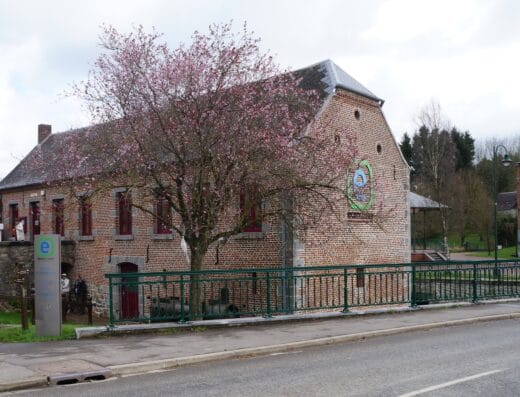 Chapelle de plan carré en brique et pierre bleue couverte d’un toit en ardoise.