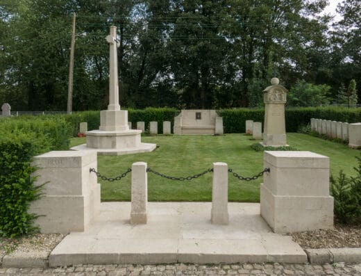 Chapelle de plan rectangulaire en brique et en pierre bleue datant de 1890. Elle dispose d’une grille en fer forgé à deux vantaux dont chacun des panneaux pleins est agrémenté d’un crucifix.