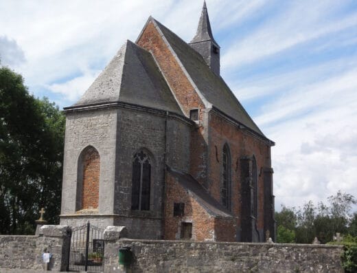 Chapelle en brique recouverte d’enduit dédiée à Sainte Thérèse de l’Enfant Jésus recouverte d’un toit en ardoise.