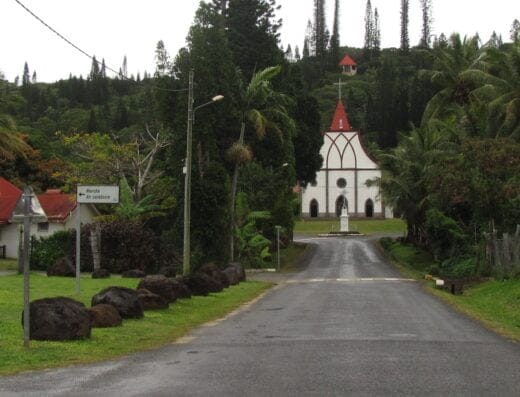 Depuis la plage, une majestueuse haie de pins colonnaires mène à l’église qui surplombe le lagon du haut d’une petite colline.