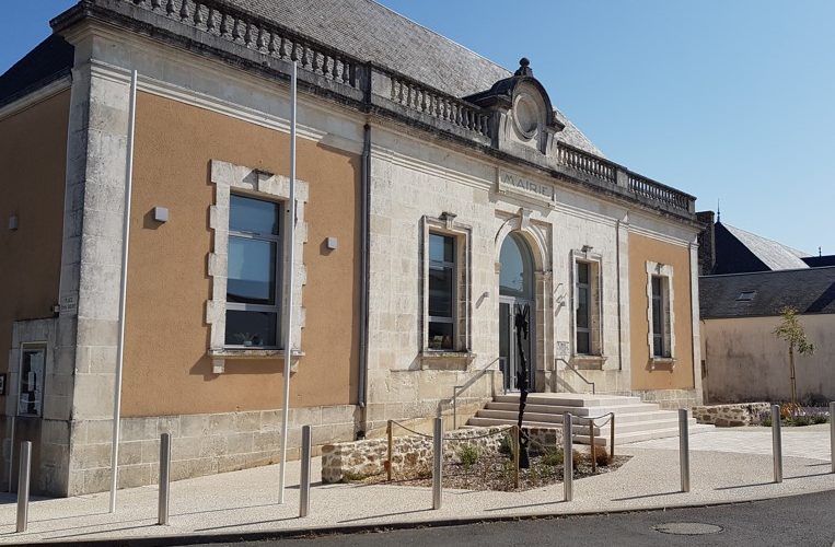 Elève d’Emile VAUDREMER et d’Henri-Pierre RAULINE, l’architecte fontenaisien Abel FILUZEAU entame la construction de la mairie en 1923, dix ans après avoir dirigé les travaux de la mairie de la ville voisine, Challans. Qualifié de « seul républicain du département » par le Préfet de la Vendée,  FILUZEAU a choisi de bâtir un édifice élégant et sobre en utilisant le tuffeau, jugé plus noble que la pierre locale.A noter que l’acrotère central de la balustrade au-dessus de la porte d’entrée devait recevoir une horloge qui n’a jamais été posée.