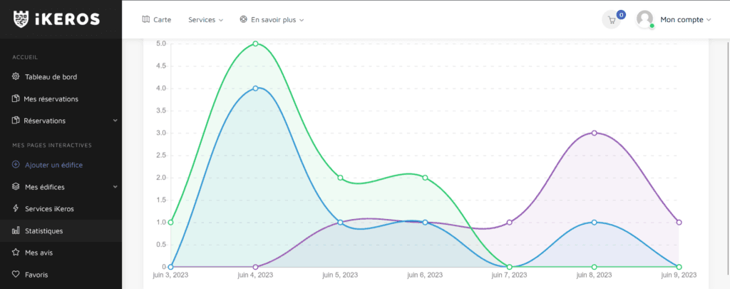 Grâce à la fonctionnalité statistiques, vous pouvez quantifier et mesurer la fréquentation de toutes vos pages iKEROS.